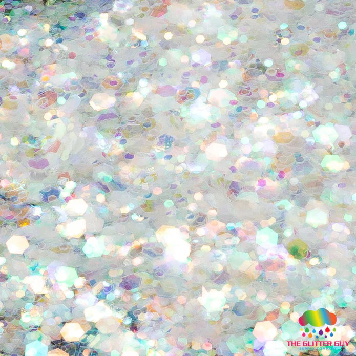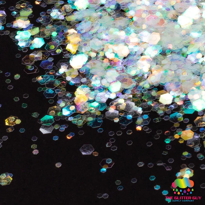 Code Cracker is a chunky mix of various sized Hack’d™ white with rainbow shimmer hexagonal cut glitter.