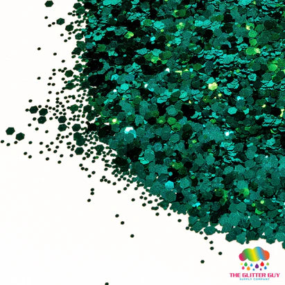 Hunter is a chunky mix of various sized metallic dark emerald green hexagonal cut glitter.