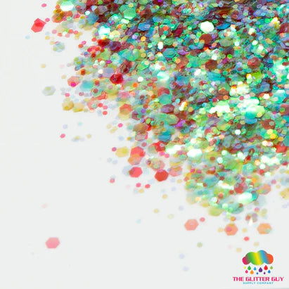 Inside Out is various sized multicolored Hack’d™ hexagonal cut glitter.
