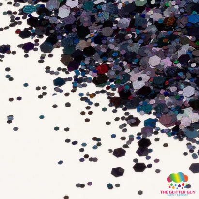 Intergalactic is various sized holographic black hexagonal cut glitter.